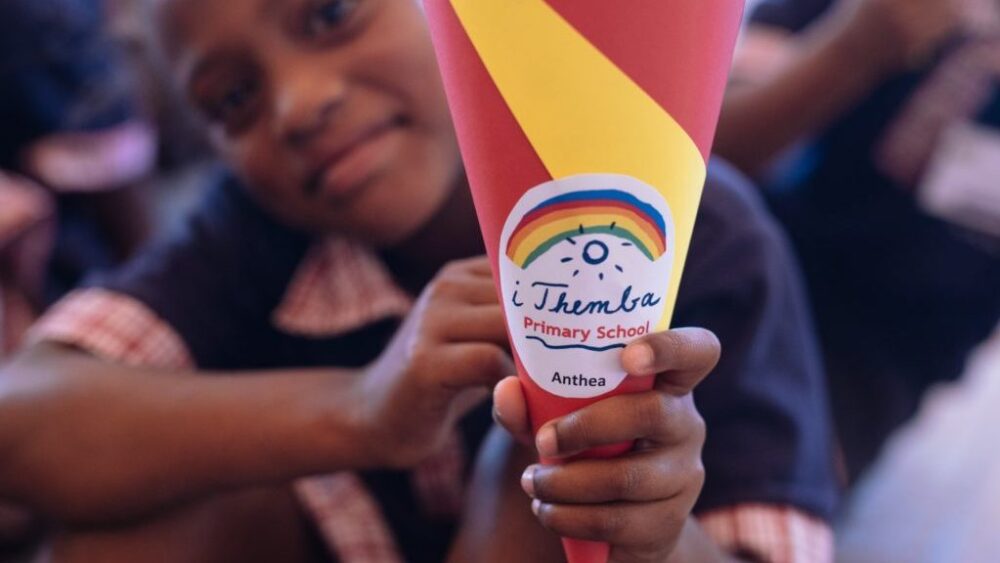 In Germany, no child has started school without it for more than 100 years: the school cone. The sweet treats it contains are designed to prepare the children for the not-always-so-sweet school routine. But this tradition does not exist in South Africa. And so the 105 girls and boys were amazed and delighted to be handed the homemade cardboard cones by help alliance patron Vivian Spohr.