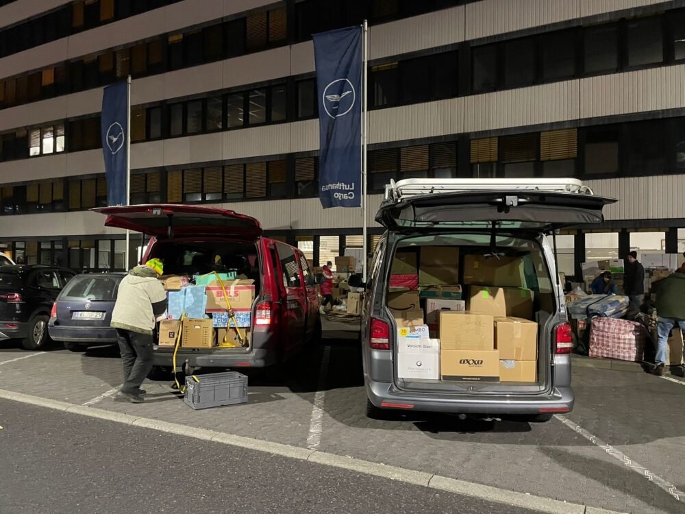 The help alliance Frankfurt community was the first who organized a collection campaign for in-kind donations: At the beginning of March, a large convoy set off from Lufthansa base in the direction of Poland. A total of 13 buses and vans loaded with relief supplies such as food, first aid items and clothing were handed over to the Polish Red Cross in Wroclaw. Another relief convoy went to Krakow and last Friday one to Budapest. Each of these convoys drove with privately organized vans and volunteer drivers. The community donated and helped with loading. The exact numbers vary but in total there were well over 20 sprinters that drove, full of food, first aid and baby supplies, blankets, sleeping bags, etc. The willingness to donate is overwhelming!