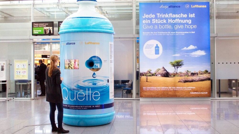 Gemeinsam mit Lufthansa haben wir deshalb eine Initiative ins Leben gerufen, die es ermöglicht, das Flaschenpfand für den Ausbau eines Brunnens in Mali zu spenden. Unter dem Motto „Jede Trinkflasche ist ein Stück Hoffnung.“ wird mit Start der Herbstferien in Bayern Anfang November 2015 am Flughafen München ein eigens für das Projekt angefertigter Sammelautomat platziert: eine Spendenquelle, die Trinkflaschen mit allen Füllständen annimmt. Dort können Passagiere bereits vor der Sicherheitskontrolle ihre Flasche schnell entsorgen und gleichzeitig etwas Gutes tun.
